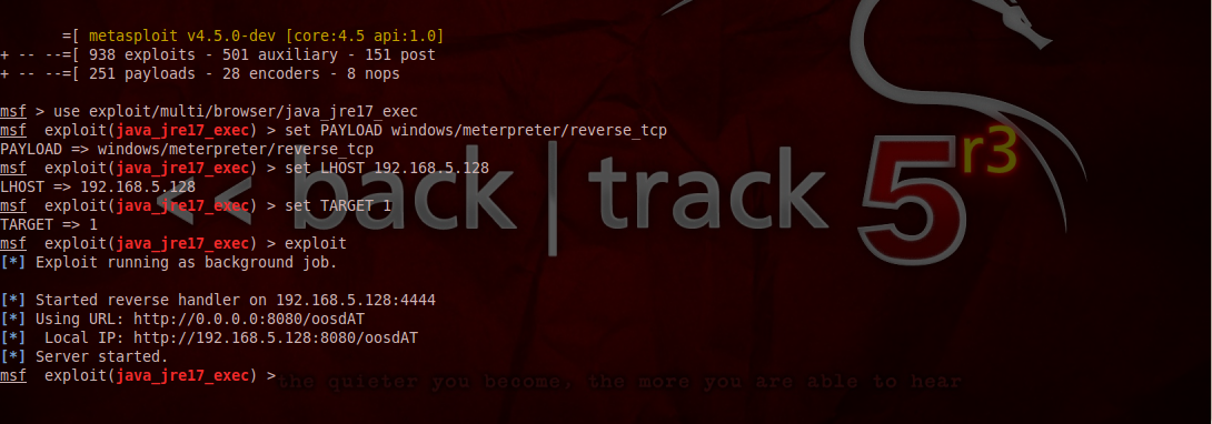 Sau khi gõ lệnh Exploit, mã khai thác sẽ được thực thi, đây là loại hình khai thác theo dạng Browsing Attack, cho nên khi tiến hành tấn công, kẻ tấn công cần phải dùng kỹ thuật Social Engineering hoặc bất kỳ kỹ thuật "lừa tình" vân...vân.... để "dụ khị" nạn nhân click vào đường dẫn chứa mã độc, đang lắng nghe trên máy BackTrack.